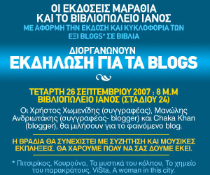 Την Τετάρτη 26 Σεπτεμβρίου 2007, στο χώρο εκδηλώσεων του βιβλιοπωλείου ΙΑΝΟΣ (Σταδίου 24) και ώρα 8 μ.μ., ο Χρήστος Χωμενίδης (συγγραφέας), ο Μανώλης Ανδριωτάκης (συγγραφέας- blogger) και ο Chaka Khan (blogger), θα μιλήσουν για το φαινόμενο blog, την εξάπλωση και την επίδραση που έχει στη σύγχρονη κοινωνία. Η βραδιά θα συνεχιστεί με συζήτηση και μουσικές εκπλήξεις. Η εκδήλωση διοργανώνεται απ’ τις εκδόσεις Μαραθιά και το βιβλιοπωλείο Ιανός, με αφορμή την κυκλοφορία των blog «Πιτσιρίκος, Κουρούνα, Τα μυστικά του κόλπου, Το χημείο του παρακράτους, ViSta, A woman in this city» σε βιβλία.