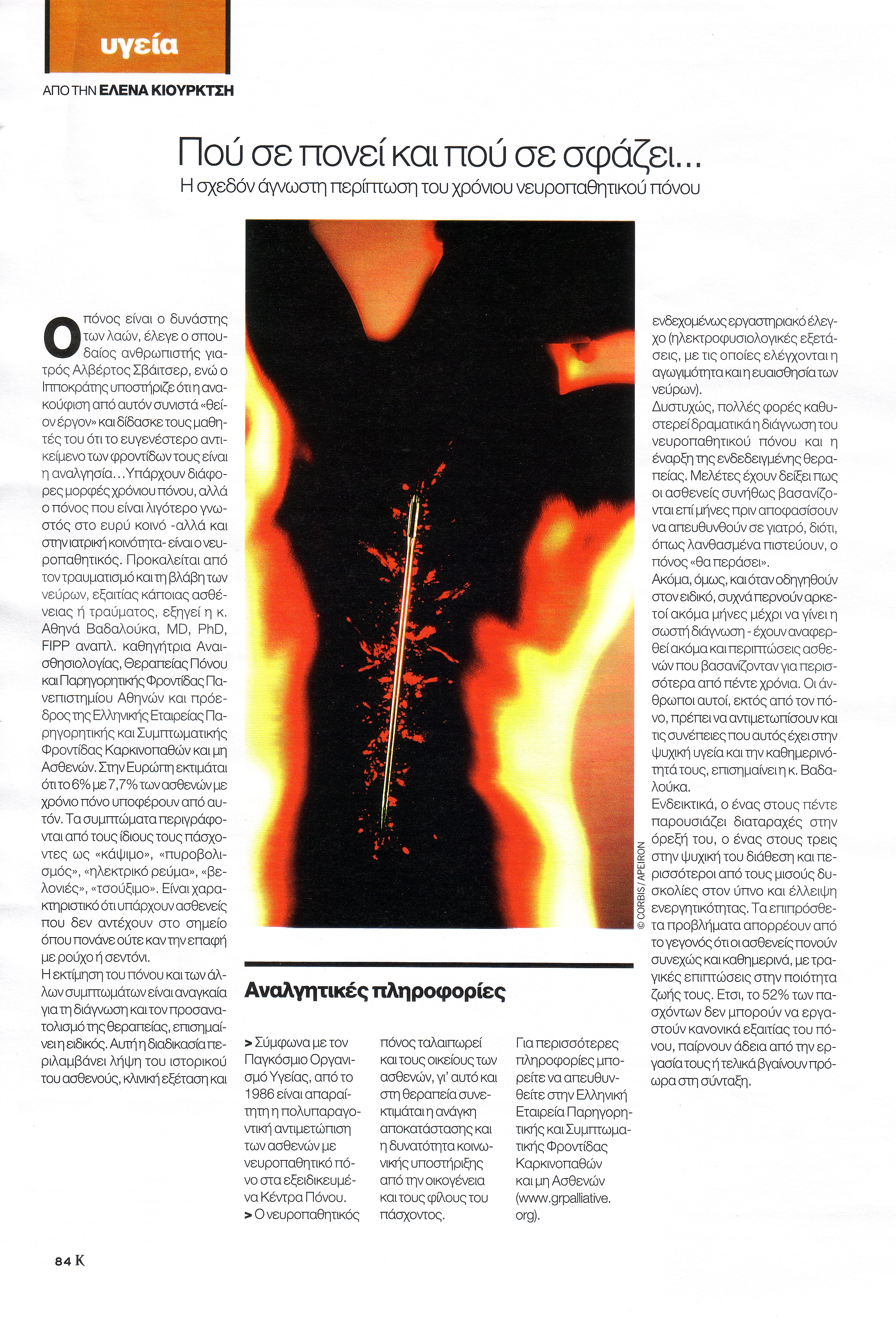 Το ξέρω: με αυτού του είδους τις αναρτήσεις σκάβω το λάκο μου. Το ξέρω ότι με τέτοιες παρατηρήσεις δεν πρόκειται να δουλέψω σε έντυπο ξανά, ούτε στον αιώνα τον άπαντα. Αισθάνομαι όμως τόσο μεγάλη την ανάγκη να μιλήσω που δε με σταματούν αυτές οι δυσοίωνες βεβαιότητες. Παρότι λοιπόν το τίμημα είναι υψηλό, προτιμώ να πω τη γνώμη μου καθαρά για δύο λόγους: α. γιατί θεωρώ ότι πρέπει να συζητήσουμε τα παθογόνα ζητήματα του Τύπου, και β. γιατί πρέπει να εκπαιδευτούμε επειγόντως στην πρόσληψη των Μέσων. Την περασμένη Κυριακή (25/10), το κυριακάτικο ένθετο της Καθημερινής, «Κ», ένα κατά τ’ άλλα πολύ σοβαρό έντυπο ποικίλης ύλης, έκανε κάτι που κατά τη γνώμη μου είναι αντιδεοντολογικό -εάν βέβαια έγινε εσκεμμένα και δεν ήταν εκ παραδρομής. Στη σελίδα 84, στον χώρο της «Υγείας» δημοσιευόταν ένα κείμενο υπογεγραμμένο απ’ την κ. Έλενα Κιουρκστή, με τίτλο Πού σε πονεί και πού σε σφάζει…. Το κείμενο αναφερόταν στον νευροπαθητικό πόνο, έναν συχνά αδιάγνωστο πόνο που ταλαιπωρεί πολλούς ανθρώπους. Ως εδώ όλα καλά. Στην ακριβώς πλαϊνή, δεξιά σελίδα όμως, φιγρουράριζε μια ολοσέλιδη διαφήμιση της πολυεθνικής φαρμακοβιομηχανίας Pfizer, η οποία μιλούσε για ένα και μόνο πράγμα: για τον νευροπαθητικό πόνο.