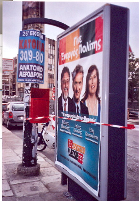 Ο προεκλογικός αγώνας για τις δημοτικές και περιφερειακές εκλογές της 7ης Νοεμβρίου εντείνεται. Καθώς η παράνομη υπαίθρια διαφήμιση έχει δεχτεί καίριο πλήγμα απ’ την κυβέρνηση, οι υποψήφιοι δήμαρχοι σκέφτονται πως θα αξιοποιήσουν τις ελάχιστες ευκαιρίες να διαφημιστούν στους δημόσιους χώρους. Στις στάσεις των λεωφορείων, σύμφωνα με τον ΚΟΚ, μπορεί να υπάρχει μόνο ένα διαφημιστικό πλαίσιο, αλλά να μην είναι ορατό απ’ τους οδηγούς. Το νόμιμο πλαίσιο δηλαδή είναι εκείνο που βρίσκεται παράλληλα προς το οδόστρωμα. Στο Δήμο Αθηναίων ωστόσο, ο δήμαρχος κ. Κακλαμάνης πρόσφατα ξήλωσε τα νόμιμα πλαίσια κι άφησε ανέγγιχτα τα παράνομα, τοποθετώντας επάνω τους τις προεκλογικές του διαφημίσεις. Μια ακόμα υποψήφια δήμαρχος, η κ. Πορτάλιου ακολούθησε το παράδειγμά του, τοποθετώντας προεκλογικά της μηνύματα στις παράνομες πινακίδες των στάσεων, ενώ ο κ. Καμίνης, μέχρι αυτή τη στιγμή, αρνείται να χρησιμοποιήσει οποιοδήποτε μέσο υπαίθριας διαφήμισης. Όλα αυτά, και κυρίως η εξοργιστική, η προκλητική αδιαφορία των εν λόγω υποψηφίων προς την οδική ασφάλεια, τη ζωή των πολιτών και τη νομιμότητα, μου φέρνουν στο μυαλό ένα θανατηφόρο τροχαίο πρίν 4 ακριβώς χρόνια. Αντιγράφω απ’ το ιστολόγιο «Διαδρομή» του Αθανάσιου Τσιώκου-Πλαπούτα, του πρωτοπόρου πολίτη στον αγώνα ενάντια στην παράνομη υπαίθρια διαφήμιση: To Σάββατο 30-9-06 στη Λ.Συγγρού στην κάθοδο απέναντι από τον ΄Αγιο Σώστη, Ι.Χ. αυτοκίνητο που σύμφωνα με μαρτυρίες δίπλα του έτρεχε με ιλιγγιώδη ταχύτητα ένα άλλο αυτοκίνητο και ανάγκασε τον οδηγό του πρώτου να χάσει τον έλεγχο,έπεσε πάνω στο παρακείμενο στέγαστρο στη στάση ΕΦΕΣΟΥ (Καλλιθέα) με αποτέλεσμα να τραυματιστούν θανάσιμα ένας άνδρας και μια κοπέλα 23 ετών, ενώ η εικοσάχρονη που είχε τραυματιστεί βαριά εξέπνευσε ήδη στο νοσοκομείο. Τα διαφημιστικά πλαίσια του στεγάστρου της στάσης ήσαν κατειλημμένα με τις φάτσες διαφημιζόμενων υποψήφιων νομαρχών και υπερνομαρχών. Ο διαφημιζόμενος στα πλαίσια του στεγάστρου υποψήφιος υπερνομάρχης είναι καθηγητής εγκληματολογίας! Του ατυχήματος έχει επιληφθεί το ΤΟΤΑ Καλλιθέας. Δηλαδή στο παραπάνω ατύχημα εμπλέκονται οι οδηγοί των δύο αυτοκινήτων,οι τρεις νεκροί (που ουσιαστικά δολοφονήθηκαν),ο δήμος Καλλιθέας μαζί με την εταιρία που τοποθέτησε το στέγαστρο, οι συγγενείς των “δολοφονημένων” που θα οδύρονται σ΄όλη τους τη ζωή και θα αναλωθούν για “να βρούν άκρη” και προπαντός ο ανύπαρκτος “ενιαίος φορέας οδικής ασφάλειας” η δημιουργία του οποίου έχει εξαγγελθεί από 20ετίας και θα λειτουργούσε μάλιστα υπό τον Πρωθυπουργό(!).