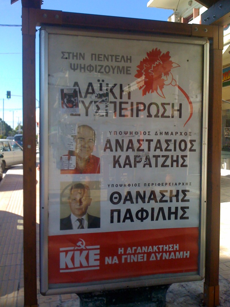 Το ΚΚΕ πρώτο και καλύτερο με το αφισαριό σε πινακίδες σήμανσης και φανάρια καθώς και με αεροπανό κλπ. (π.χ. στη ΝΕΟ Πατρών, στο Πανεπιστήμιο Πατρών κλπ.)