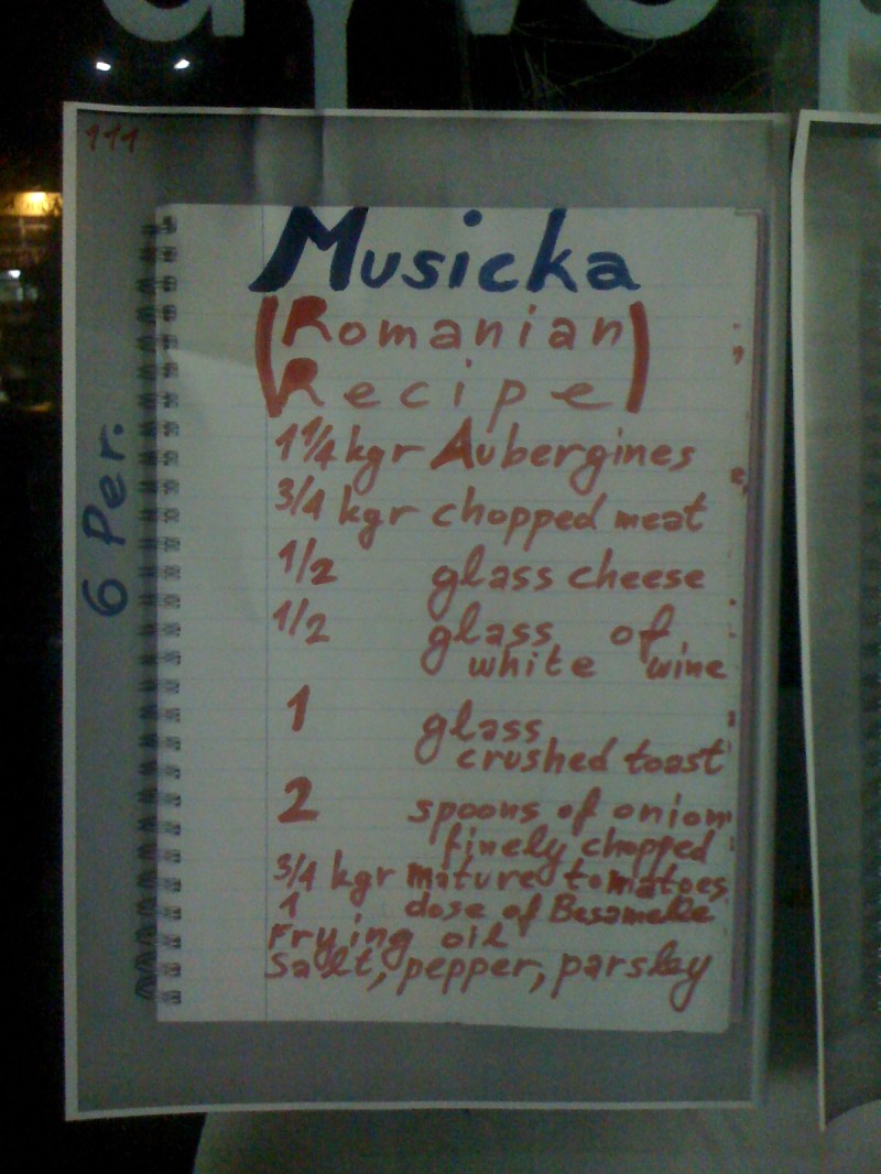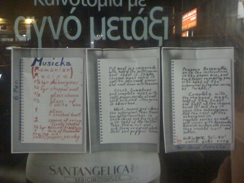 Κανονικά όλη η Ελλάδα θα έπρεπε να είναι στις κουζίνες με όλη αυτή τη μόδα στην τηλεόραση. Αλλά εδώ τα πράγματα μπερδεύονται. Ελάχιστοι κι ελάχιστες είναι εκείνοι κι εκείνες που μοιράζονται με τον κόσμο τις γνώσεις τους. Και μάλλον τις επιδεικνυουν παρά τις μοιράζονται. Είναι η σπανιότητα της δημοσιότητας, το σταρ σύστεμ, που θέλει λίγους και καλούς να δημιουργούν και να έχουν πρόσβαση σε όλα τα σπίτια. Οι άλλοι, ας πάνε στο δρόμο να δείξουν τις συνταγές τους. Ευτυχώς υπάρχει ακόμα ο δρόμος, και το Διαδίκτυο… Κόσμοι ασύμβατοι: η τηλεόραση, τα παραδοσιακά Μέσα απ’ τη μια πλευρά, κι ο δρόμος με το Διαδίκτυο απ’ την άλλη. Στην τηλεόραση οι φωτογενείς, οι «ωραίοι», οι επιτυχημένοι, οι ποζάτοι και στο δρόμο ο λαός, οι θεατές, οι πεινασμένοι. Στέκομαι μπροστά απ’ τη ρουμάνικη συνταγή και σκέφτομαι. Θα ανεβάσω την ιστορία στο μπλογκ μου, σκέφτομαι. Αυτός ή αυτή που την τοποθέτησε εδώ, θα πρέπει να ξεκινήσει ένα δικο του μπλογκ. Οι τοιχοκολημένες σελίδες είναι φροντισμένες, ο γραφικός χαρακτήρας ευανάγνωστος, και πιθανότατα η συνταγή να είναι πολύ νόστιμη, δεν τη δοκίμασα ακόμα. Άραγε να είναι Ρουμάνος, άνδρας, ή γυναίκα; Τί σημαίνει στο πλάι, ο αριθμός 111; Είναι νούμερο συνταγής; Ή κάτι άλλο; Όποια ή όποιος το έκανε πρέπει να ξέρει ότι η κίνηση αυτή είναι αυθεντική και άκρως συμβολική. Υποκλίνομαι και χαμογελώ.Δεύτερη σκέψη τελευταίας στιγμής: λέτε να πιάστηκα στην παγίδα κάποιας διαφημιστικής viral street guerilla καμπάνιας:-)
