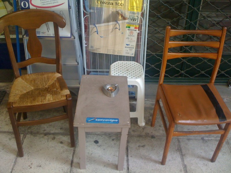 Περπατώντας μια μέρα στην Ιπποκράτους στάθηκα μπροστά απ’ αυτή την εικόνα. Μια απλώστρα, μια σκάλα, δύο καρέκλες, ένα σκαμπό, ένα τραπεζάκι, ένα τασάκι με γόπες, κι ένα αυτοκόλητο που λέει “Καπνιστήριο”. Στο πεζοδρόμιο. Το πρώτο πράγμα που έκανα ήταν να γελάσω, μετά να φωτογραφήσω και μετά να πέσω σε βαθιά περισυλλογή, απ’ την οποία ακόμα δεν έχω βγει.