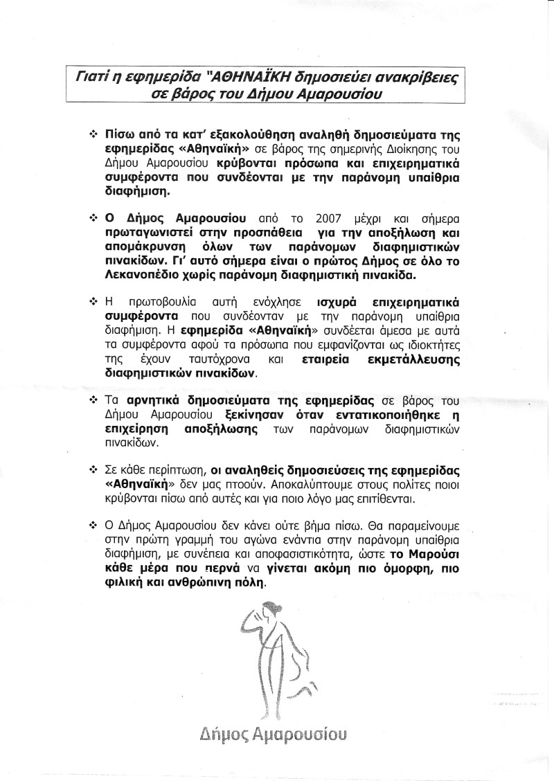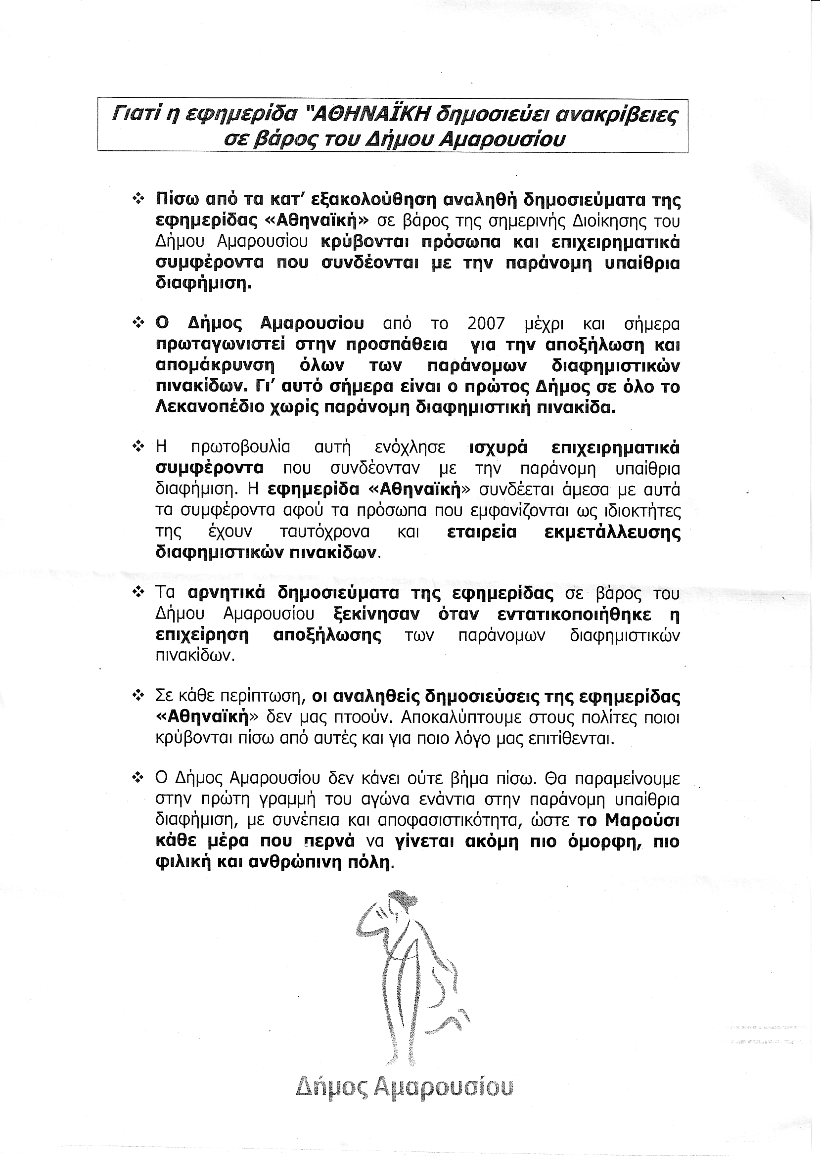 Από το 2007 μέχρι σήμερα ο Δήμος Αμαρουσίου, έχοντας θέσει ως προτεραιότητα την ενίσχυση της ασφάλειας όσων κινούνται στο οδικό δίκτυο της πόλης μας, αλλά και την αισθητική αναβάθμιση της εικόνας του Αμαρουσίου, πρωταγωνιστεί στην προσπάθεια για την αποξήλωση όλων των παράνομων διαφημιστικών πινακίδων, οι οποίες βρίσκονται στα όρια της πόλης.